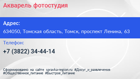 Акварель, фотостудия по адресу 634050, Томская область, Томск, проспект Ленина, 63 в дальнейшем Организация, размещена в следующих категориях: