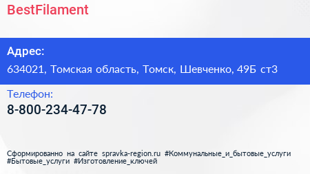 BestFilament по адресу 634021, Томская область, Томск, Шевченко, 49Б ст3 в дальнейшем Организация, размещена в следующих категориях: