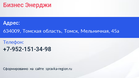 Бизнес-Энерджи по адресу 634009, Томская область, Томск, Мельничная, 45а в дальнейшем Организация, размещена в следующих категориях: