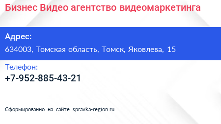 Бизнес Видео, агентство видеомаркетинга по адресу 634003, Томская область, Томск, Яковлева, 15 в дальнейшем Организация, размещена в следующих категориях: