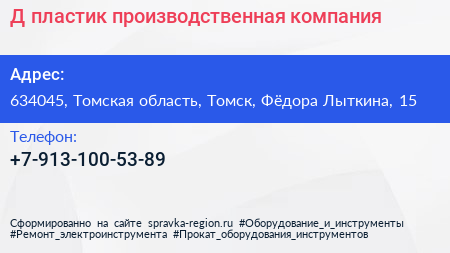 Д-пластик, производственная компания по адресу 634045, Томская область, Томск, Фёдора Лыткина, 15 в дальнейшем Организация, размещена в следующих категориях: