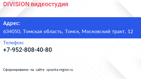 DIVISION, видеостудия по адресу 634050, Томская область, Томск, Московский тракт, 12 в дальнейшем Организация, размещена в следующих категориях: