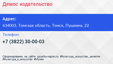 Демос, издательство по адресу 634003, Томская область, Томск, Пушкина, 22 в дальнейшем Организация, размещена в следующих категориях: