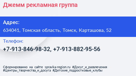Джемм, рекламная группа по адресу 634041, Томская область, Томск, Карташова, 52 в дальнейшем Организация, размещена в следующих категориях: