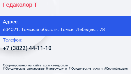 Гедаколор-Т по адресу 634021, Томская область, Томск, Лебедева, 78 в дальнейшем Организация, размещена в следующих категориях:
