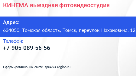 КИНЕМА, выездная фотовидеостудия по адресу 634050, Томская область, Томск, переулок Нахановича, 12 в дальнейшем Организация, размещена в следующих категориях: