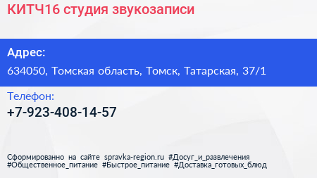 КИТЧ16, студия звукозаписи по адресу 634050, Томская область, Томск, Татарская, 37/1 в дальнейшем Организация, размещена в следующих категориях: