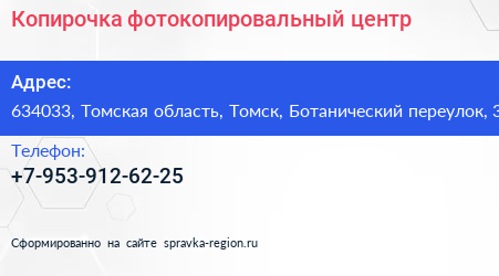Копирочка, фотокопировальный центр по адресу 634033, Томская область, Томск, Ботанический переулок, 3 в дальнейшем Организация, размещена в следующих категориях: