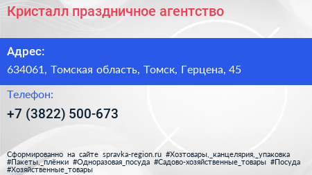 Кристалл, праздничное агентство по адресу 634061, Томская область, Томск, Герцена, 45 в дальнейшем Организация, размещена в следующих категориях: