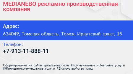 MEDIANEBO, рекламно-производственная компания по адресу 634049, Томская область, Томск, Иркутский тракт, 15 в дальнейшем Организация, размещена в следующих категориях: