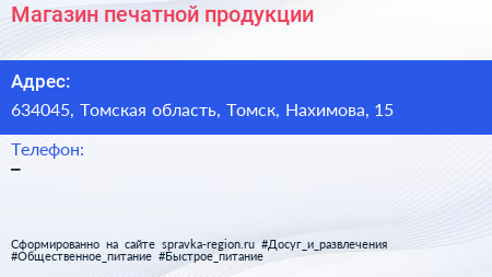 Магазин печатной продукции по адресу 634045, Томская область, Томск, Нахимова, 15 в дальнейшем Организация, размещена в следующих категориях: