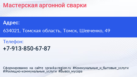 Мастерская аргонной сварки по адресу 634021, Томская область, Томск, Шевченко, 49 в дальнейшем Организация, размещена в следующих категориях: