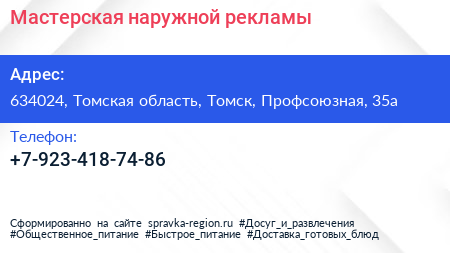 Мастерская наружной рекламы по адресу 634024, Томская область, Томск, Профсоюзная, 35а в дальнейшем Организация, размещена в следующих категориях: