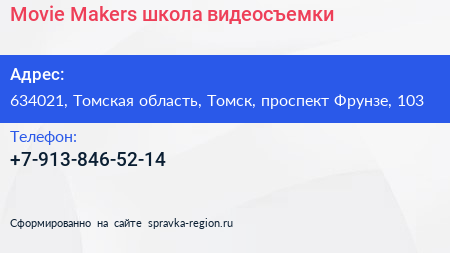 Movie Makers, школа видеосъемки по адресу 634021, Томская область, Томск, проспект Фрунзе, 103 в дальнейшем Организация, размещена в следующих категориях: