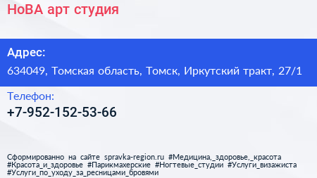 НоВА, арт-студия по адресу 634049, Томская область, Томск, Иркутский тракт, 27/1 в дальнейшем Организация, размещена в следующих категориях: