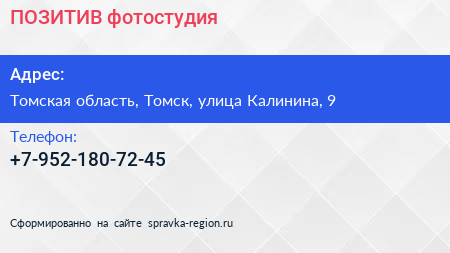ПОЗИТИВ, фотостудия по адресу Томская область, Томск, улица Калинина, 9 в дальнейшем Организация, размещена в следующих категориях: