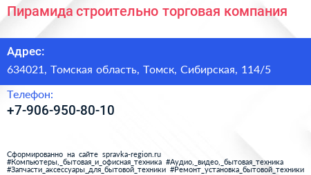 Пирамида, строительно-торговая компания по адресу 634021, Томская область, Томск, Сибирская, 114/5 в дальнейшем Организация, размещена в следующих категориях: