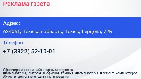 Реклама, газета по адресу 634061, Томская область, Томск, Герцена, 72Б в дальнейшем Организация, размещена в следующих категориях: