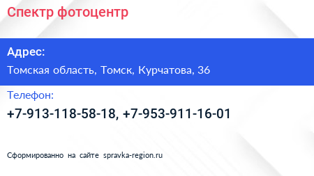 Спектр, фотоцентр по адресу Томская область, Томск, Курчатова, 36 в дальнейшем Организация, размещена в следующих категориях: