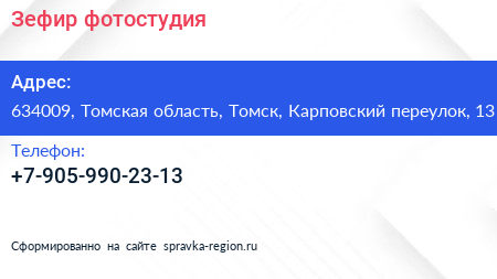 Зефир, фотостудия по адресу 634009, Томская область, Томск, Карповский переулок, 13 в дальнейшем Организация, размещена в следующих категориях: