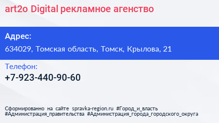 art2o Digital, рекламное агенство по адресу 634029, Томская область, Томск, Крылова, 21 в дальнейшем Организация, размещена в следующих категориях: