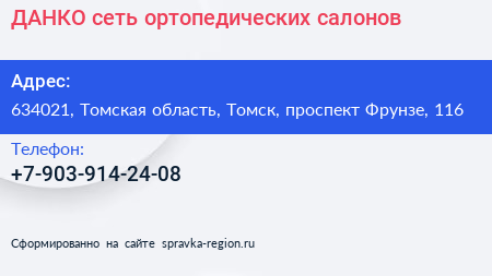 ДАНКО, сеть ортопедических салонов по адресу 634021, Томская область, Томск, проспект Фрунзе, 116 в дальнейшем Организация, размещена в следующих категориях: