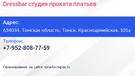 Dressbar, студия проката платьев по адресу 634034, Томская область, Томск, Красноармейская, 101а в дальнейшем Организация, размещена в следующих категориях: