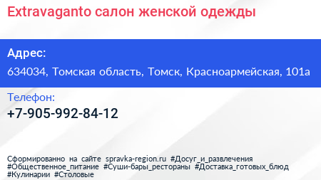 Extravaganto, салон женской одежды по адресу 634034, Томская область, Томск, Красноармейская, 101а в дальнейшем Организация, размещена в следующих категориях: