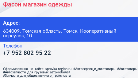 Фасон, магазин одежды по адресу 634009, Томская область, Томск, Кооперативный переулок, 10 в дальнейшем Организация, размещена в следующих категориях:
