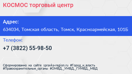 КОСМОС, торговый центр по адресу 634034, Томская область, Томск, Красноармейская, 101Б в дальнейшем Организация, размещена в следующих категориях: