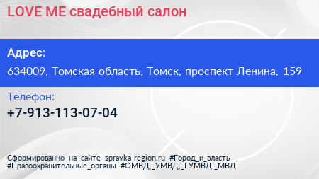 LOVE ME, свадебный салон по адресу 634009, Томская область, Томск, проспект Ленина, 159 в дальнейшем Организация, размещена в следующих категориях: