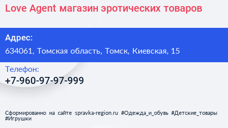 Love Agent, магазин эротических товаров по адресу 634061, Томская область, Томск, Киевская, 15 в дальнейшем Организация, размещена в следующих категориях: