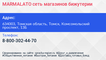 MARMALATO, сеть магазинов бижутерии по адресу 634003, Томская область, Томск, Комсомольский проспект, 13Б в дальнейшем Организация, размещена в следующих категориях: