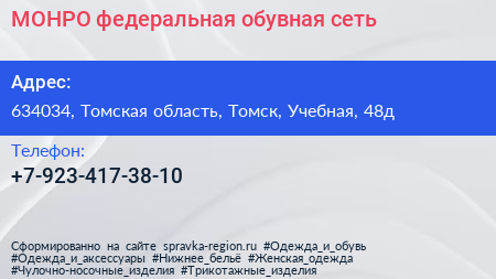МОНРО, федеральная обувная сеть по адресу 634034, Томская область, Томск, Учебная, 48д в дальнейшем Организация, размещена в следующих категориях: