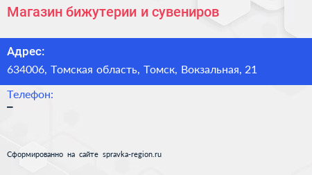 Магазин бижутерии и сувениров по адресу 634006, Томская область, Томск, Вокзальная, 21 в дальнейшем Организация, размещена в следующих категориях: