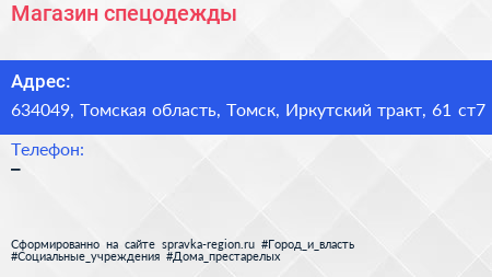 Магазин спецодежды по адресу 634049, Томская область, Томск, Иркутский тракт, 61 ст7 в дальнейшем Организация, размещена в следующих категориях: