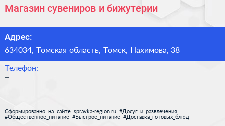 Магазин сувениров и бижутерии по адресу 634034, Томская область, Томск, Нахимова, 38 в дальнейшем Организация, размещена в следующих категориях: