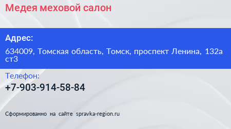Медея, меховой салон по адресу 634009, Томская область, Томск, проспект Ленина, 132а ст3 в дальнейшем Организация, размещена в следующих категориях: