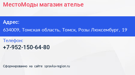 МестоМоды, магазин-ателье по адресу 634009, Томская область, Томск, Розы Люксембург, 19 в дальнейшем Организация, размещена в следующих категориях:
