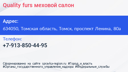 Quality furs, меховой салон по адресу 634050, Томская область, Томск, проспект Ленина, 80а в дальнейшем Организация, размещена в следующих категориях: