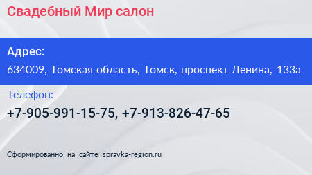 Свадебный Мир, салон по адресу 634009, Томская область, Томск, проспект Ленина, 133а в дальнейшем Организация, размещена в следующих категориях: