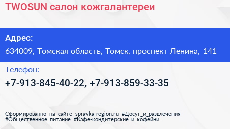 TWOSUN, салон кожгалантереи по адресу 634009, Томская область, Томск, проспект Ленина, 141 в дальнейшем Организация, размещена в следующих категориях: