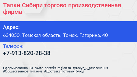 Тапки Сибири, торгово-производственная фирма по адресу 634050, Томская область, Томск, Гагарина, 40 в дальнейшем Организация, размещена в следующих категориях: