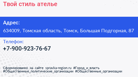 Твой стиль, ателье по адресу 634009, Томская область, Томск, Большая Подгорная, 87 в дальнейшем Организация, размещена в следующих категориях: