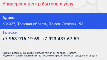 Универсал, центр бытовых услуг по адресу 634027, Томская область, Томск, Ленская, 53 в дальнейшем Организация, размещена в следующих категориях: