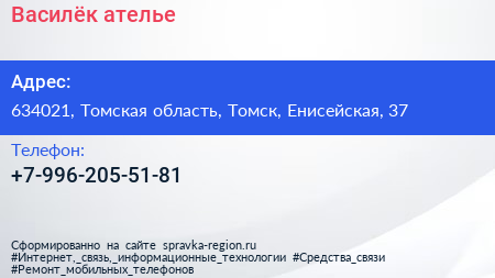 Василёк, ателье по адресу 634021, Томская область, Томск, Енисейская, 37 в дальнейшем Организация, размещена в следующих категориях: