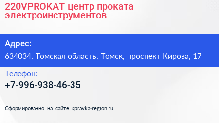 220VPROKAT, центр проката электроинструментов по адресу 634034, Томская область, Томск, проспект Кирова, 17 в дальнейшем Организация, размещена в следующих категориях: