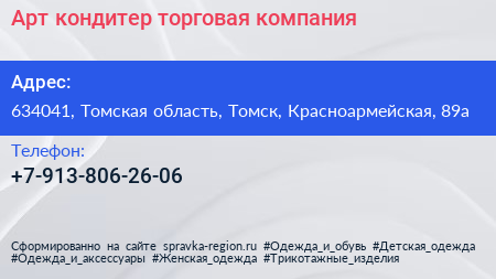 Арт-кондитер, торговая компания по адресу 634041, Томская область, Томск, Красноармейская, 89а в дальнейшем Организация, размещена в следующих категориях:
