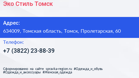 Эко Стиль Томск по адресу 634009, Томская область, Томск, Пролетарская, 60 в дальнейшем Организация, размещена в следующих категориях: