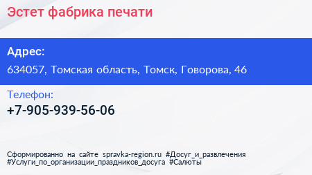 Эстет, фабрика печати по адресу 634057, Томская область, Томск, Говорова, 46 в дальнейшем Организация, размещена в следующих категориях: